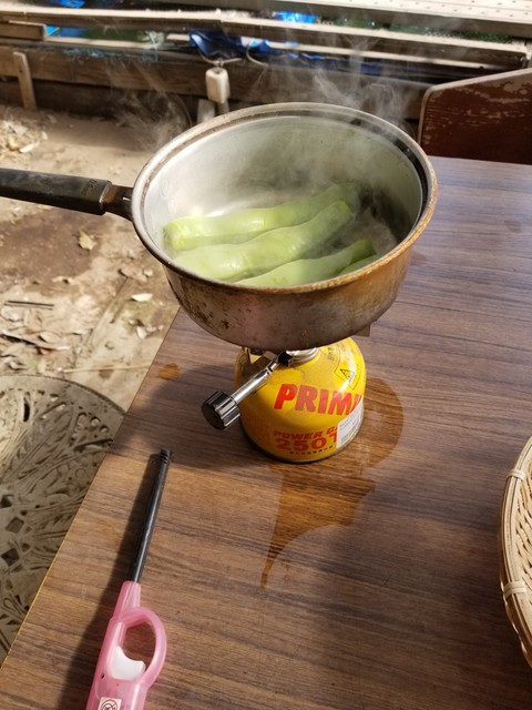 そこでキャンプ用のガスバーナーがあったので、それで鍋で焼いた。