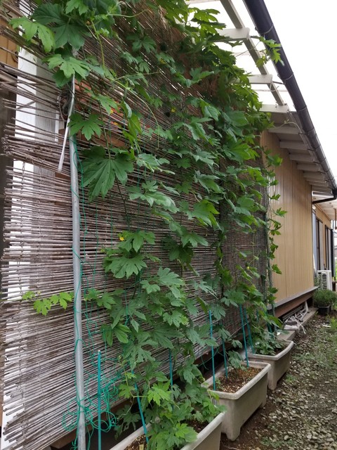 塾の教室の西側にはゴーヤのグリーンカーテンが育っている。