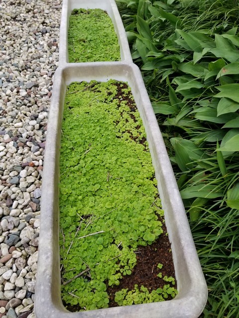 プランターの緑はコケではない。西洋サクラソウの幼苗である。