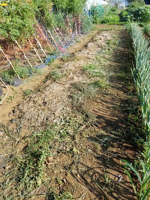 今回は、透明マルチの下に2本灌水ホースが入っている畝は、スイカとメロンと敷き藁を片付けてビニトンしたままにして置きます。