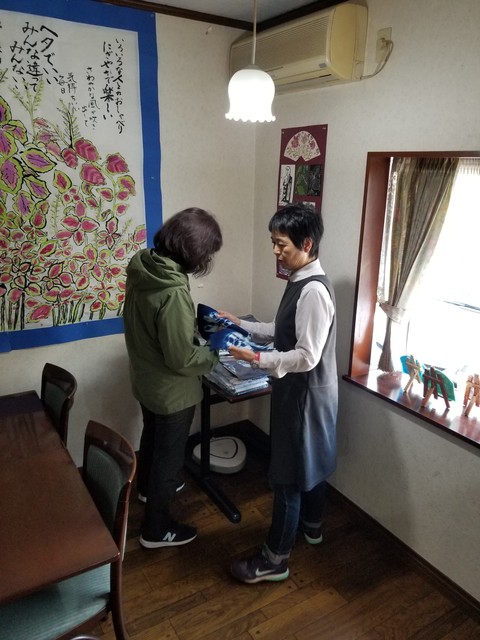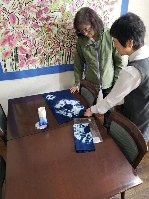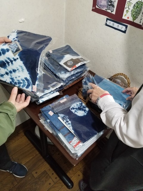 妻の藍染の作品の展示即売コーナーである。