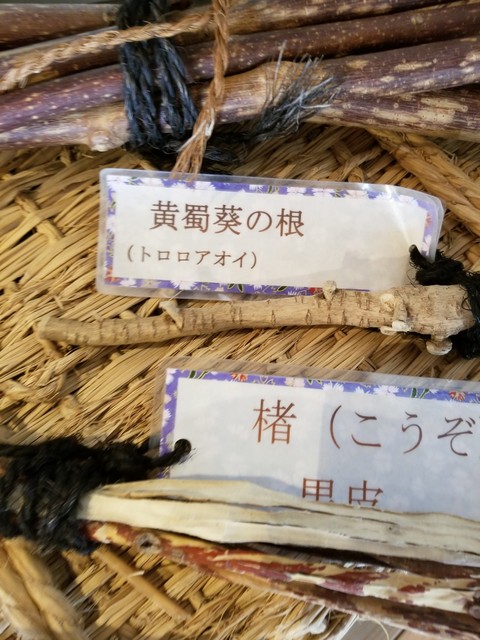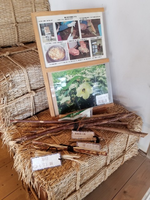 和紙作りの体験学習のできる建物で、ふと目に止まったものがあった。それは「とろろあおい」である。夏に作って花を楽しんだ花オクラである。花オクラは属名で正式名称はとろろあおいである。その根っこを使って和紙を作れることは初めて知った。コウゾやミツマタはよく知っていたが。
