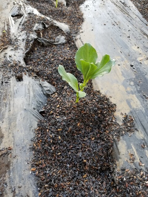 マルチをすることで、泥跳ねを防ぎべと病などの予防をする。また、黒は熱を吸収し保温効果がある。定植したばかりなので、燻炭で、通気性を維持させながら保水性をもたせ根の活着を促す。