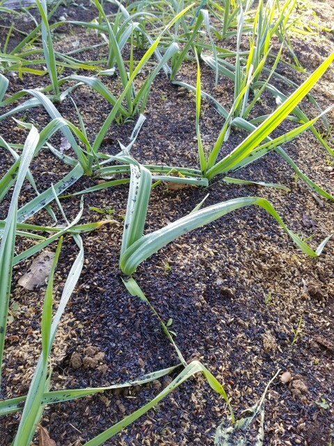 にんにくは特にべと病やさび病にかかりやすく、籾殻米ぬかマルチの上に、さらに燻炭を補強した。冬場の保温効果を期待している。