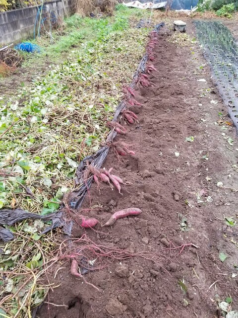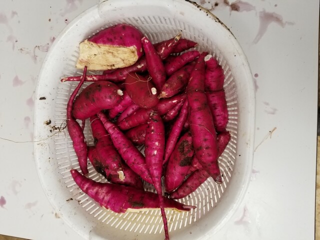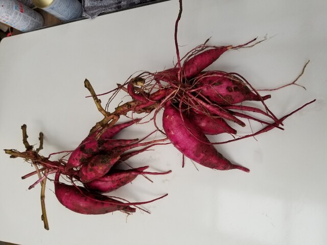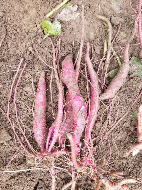 昨年友人が別の畑で作ってうまく行った。窒素分の多い畑なので蔓ボケするが、そのまま今頃まで育てていたことで、1株から3,4本の太いサツマイモが出来た。