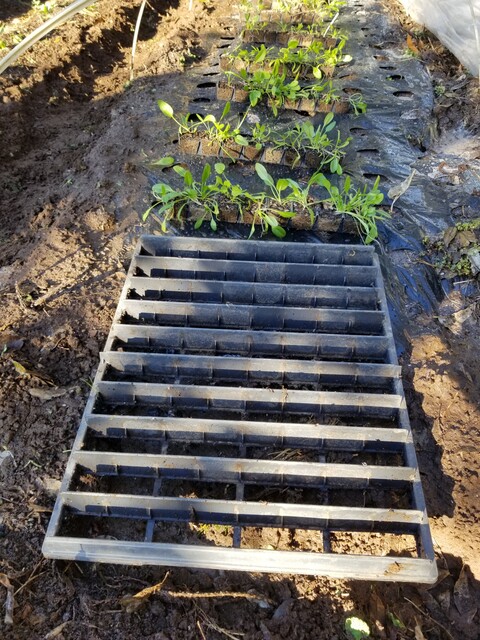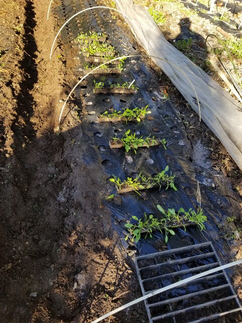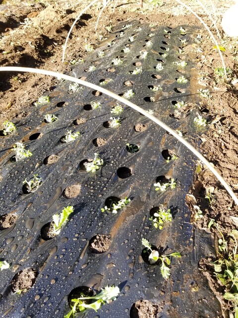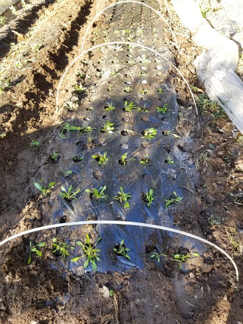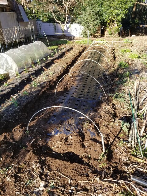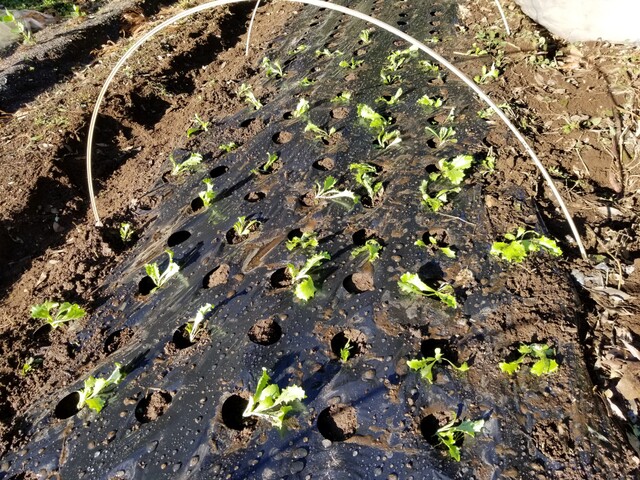 温床で育苗していた葉物野菜を、トンネル栽培してみようと畑に定植した。