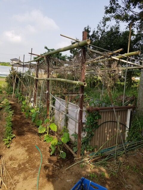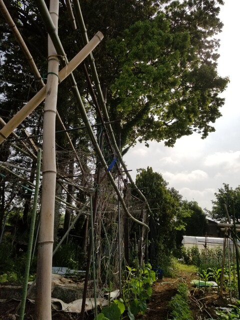 支柱もしっかり補強なさって 準部万端 デカイかぼちゃが鈴なりになっても