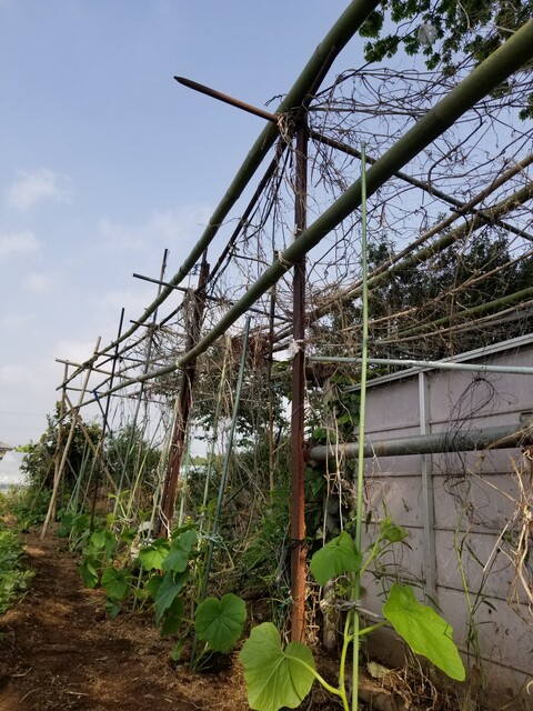 カボチャ🎃は、スイカ、キュウリの台木(新土佐カボチャ)を栽培しましたが、1株で10m四方を覆い尽くす勢力に驚きました。ミカン畑の伊予柑を、覆い尽くして救出した経験が有ります。