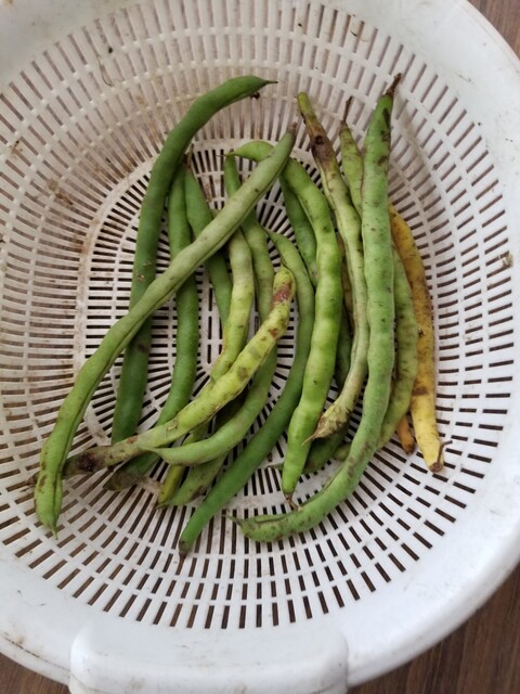 インゲンの種採りである。インゲンの場合莢が緑から白っぽくなった段階で、ほとんど熟成しているようだ。毎年この段階で収穫して、種に使っているが発芽率も良く、種も真っ白で綺麗な状態で収穫できる。莢が黄色くなったものには、ほとんど虫が入っているか、湿気で腐っているものが多い。