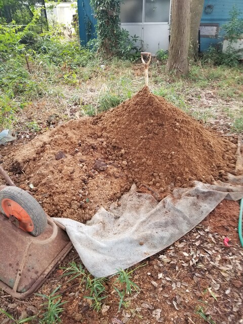 40Lの7袋と30Lの3袋の計10袋に、馬糞堆肥を詰め込んで、畑に運ぶ。