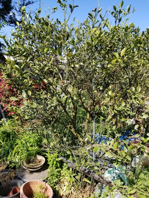 👇の画像は、2番目に大きなミカンの木である。葉が冬の間に落ちてしまって、ほとんど葉がついていない。