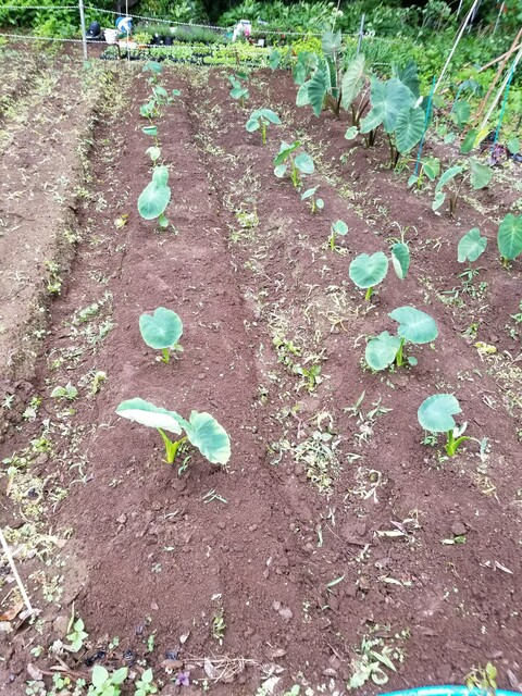 夏の水不足対策に 里芋の横に土を掘って木の新葉をたっぷり入れたんだけど、窒素が効きすぎて芋が太らないかも。