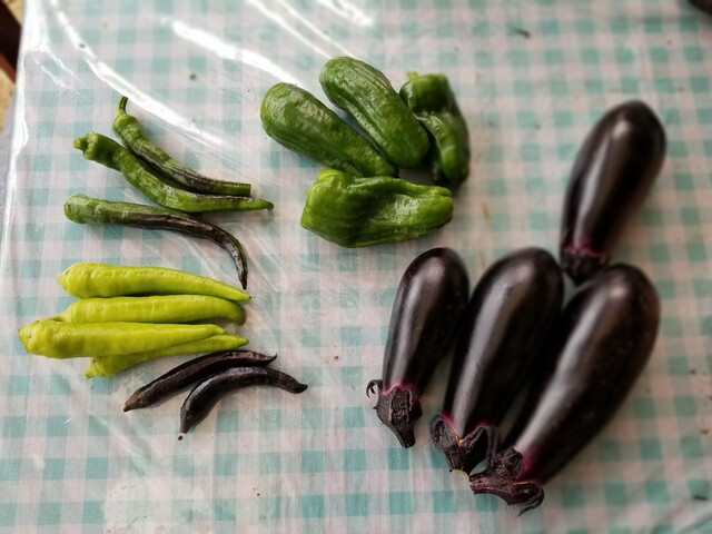収穫した中長ナスとピーマン、シシトウ3種である。
