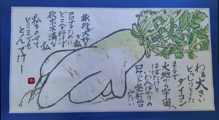 妻の絵手紙 大根 2021年12月09日 11:00 太くなりすぎた大根。抜いてみてびっくり。 太くなりすぎた大根は、調理が大変だから細いのを持ってきてと言われていた。そう言われても、大根は一斉に足並み揃えて大きく育つ。ましてや、こんなにもへんてこりんな大根は、きっと嫌がるだろうと思っていた。一日、畑に放って置いた。次の日に、絵手紙の先生が来る日だったので、お土産に持たせようと、他の野菜と一緒に置いておいた。家に帰ったら、何と妻が気に入って、絵手紙になっていた。➡前回の記事へ 妻の絵手紙 龍馬生姜 本日も、ぽちっと応援よろしくお願いします。 「妻の部屋のコーナー」カテゴリの最新記事 < 前の記事次の記事 > コメント コメント一覧 (4) 1. 農園主 2021年12月09日 21:21 ナイスなお大根が題材になりましたね‼️ インパクトがあり、絵手紙になると面白いですね😃 このままコロナが終息を迎え、奥様の好きな旅行にたくさん行けたら良いですね☆彡 0 nojisan1 がしました 2. のじさん 2021年12月10日 06:07 >>1、農園主さん、おはようございます。 形が変でも大根には違いないので、絵手紙の題材には面白いですね。 今年は、大根の畝にも同じように馬糞堆肥をたくさん投入してしまったので、繊維が当たって股根が出来てしまったようです。 何処にも出かけていないので、旅行がしたいのでしょう。 0 nojisan1 がしました 3. 甘姫です~ 転載 2021年12月10日 06:27 👇 奥様の絵手紙、いつも素敵ですね!! 0 nojisan1 がしました 4. のじさん 2021年12月10日 06:28 >>3、甘姫さん、おはようございます。 絵手紙のコメントありがとうございます。 変わった野菜を見て、野菜の生命力の強さに心が動かされたのでしょう。 甘姫さんが、野良の野菜に出会ったときに、さあどんな料理にして食べようかという感じに似ていると思います。 0 nojisan1 がしました コメントフォーム 名前 コメント 記事の評価 リセット リセット 顔 星 情報を記憶 コメントを投稿する