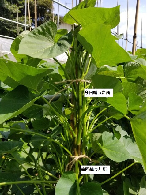さつまいも垂直仕立て栽培 丁寧なお世話をなさってご苦労様です