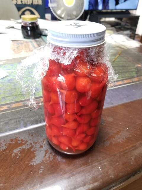 梅酢に砂糖を少し追加して、瓶に漬け込んだ。