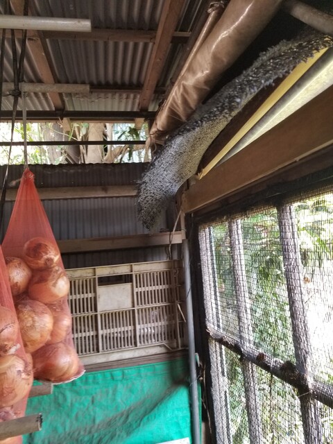 屋根の上には、隣の空き家の大きな木の陰になっていて、比較的夏でも涼しい風が入る。南北に長い小屋であり、南北のドアは常に開けてあり、風が通り抜けている。