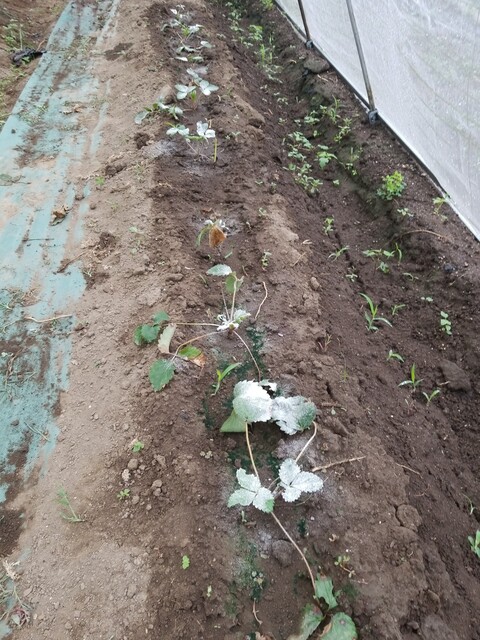 👇は、ミニハウスに定植した間欠冷蔵処理をした章姫である。
