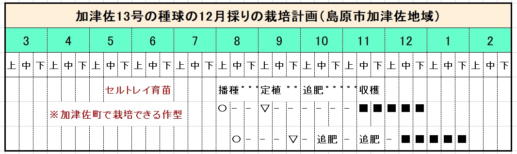 👇は、加津佐13号の11月~12月収穫の作型である。温暖な島原市加津佐地域の作型である。