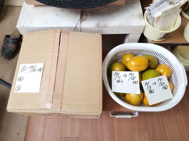 👇は、ビニールの袋に大きいものは4個、小さなものは6個入れて、袋を縛り箱に入れて、1週間以上部屋の中に置いた。