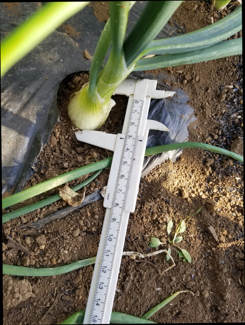 👇は、篠原早生白玉ねぎF2の玉の直径を計測した画像である。現在5.7㎝に育っている。
