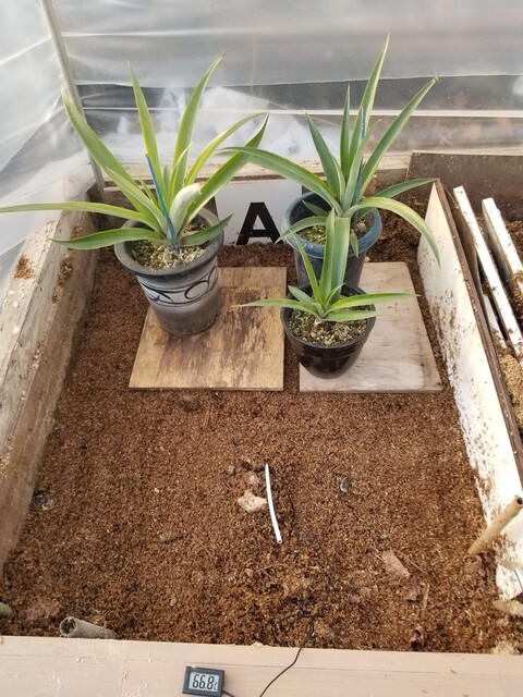 👇は、温床の熱を利用して、温室のようにして、パイナップルの苗木を越冬させている。