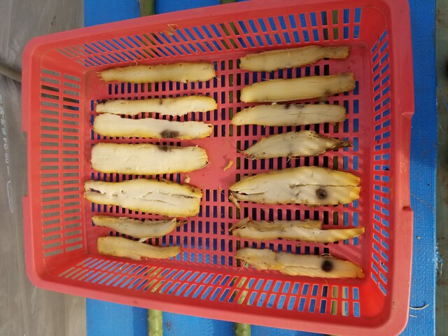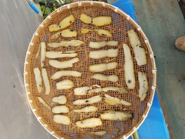 👇は、スライサーで約1㎝幅でスライスしたものを、ミニハウス内で干している画像である。