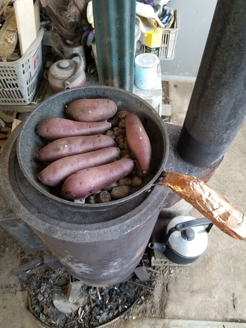 👇は、例のごとく自家製の石焼き芋器で、薪ストーブを使って焼いている。