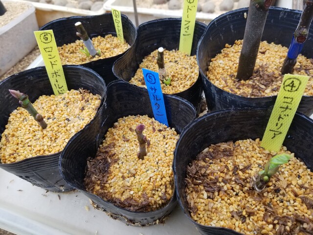 以下は、その時に穂木をカットして、硬質化沼土に挿し木した画像である。