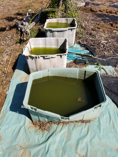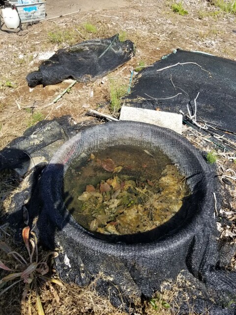 👇は、畑に2穴を掘って、ゴミが入らないように寒冷紗で覆っていた溜め水である。