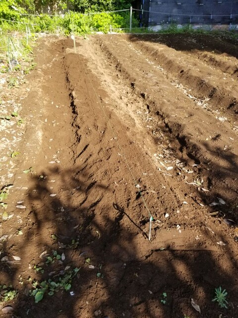 👇は、40坪の畑に、5畝の溝を掘り、1畝に鶏糞堆肥を1袋ずつ撒き終わって、土を埋め戻した画像である。