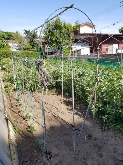 👇は、露地栽培用に直管パイプとトンネルアーチを組み合わせて簡易棚を作った。
